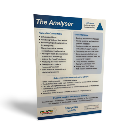 Large, laminated A2 (420mm × 594mm) versions of the Click! Colours Discovery Cards. Great visual reminders of the Click! Colours that will help your people understand and leverage diversity. Use them in your workplace or to run your own Click! Colours Workshops.
